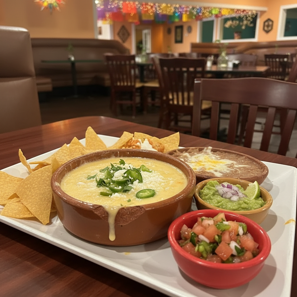 Chile con queso with refried beans, guacamole, and pico de gallo. (Add beef or chicken fajita: +$2.50)