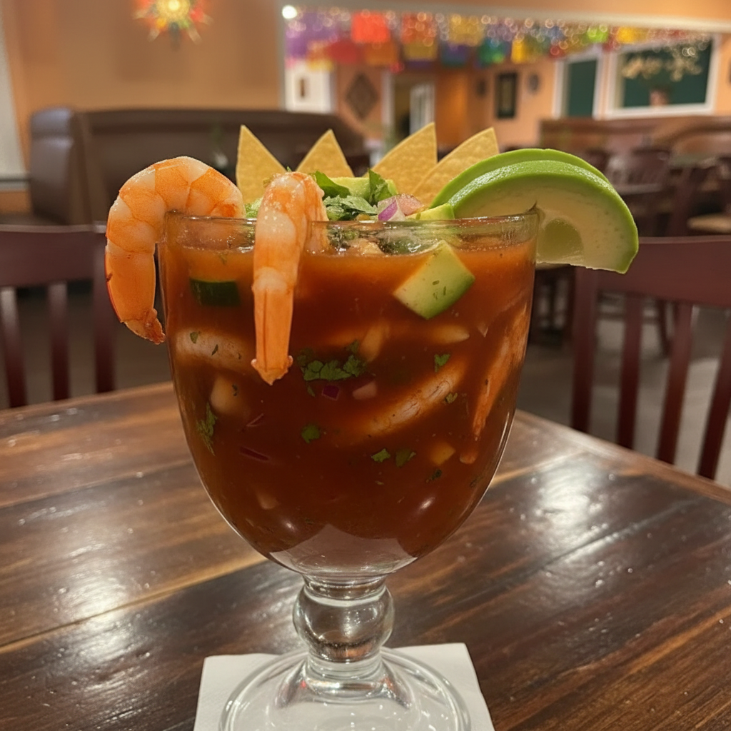 Bay shrimp in a spicy tomato sauce, with avocado and pico de gallo.