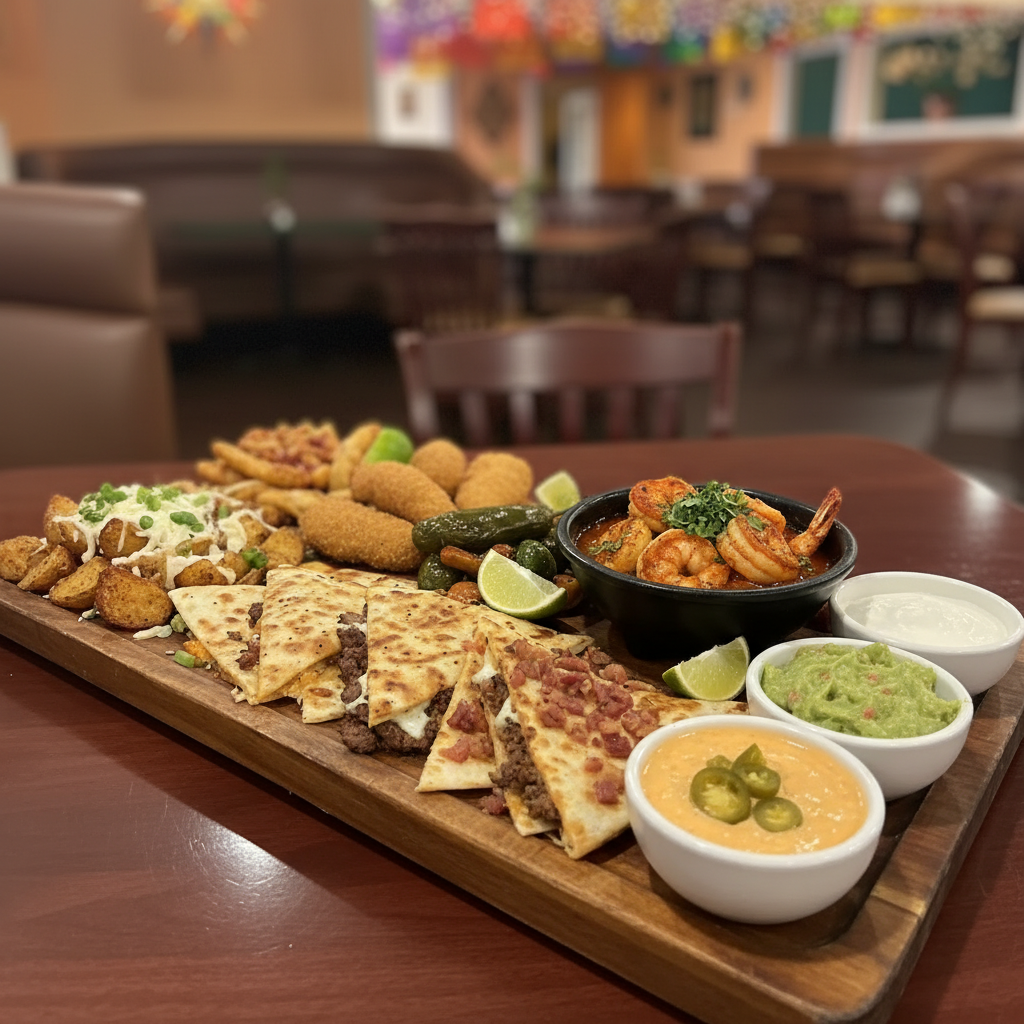 A sampler of Papas Locas, Shrimp Diablo, Stuffed Jalapeños, and Beef or Chicken Quesadillas; with chile con queso, guacamole, and sour cream.