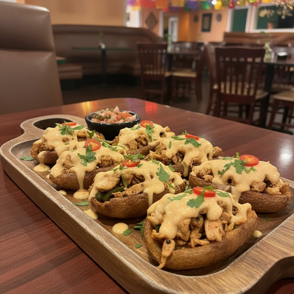 Fried potato skins with chile con queso and beef or chicken fajita.