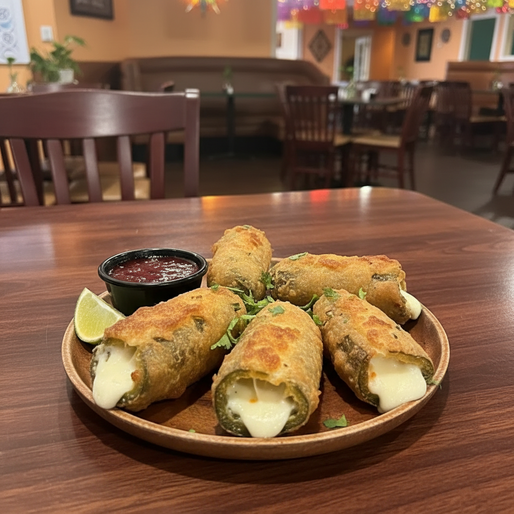 Deep fried avocado stuffed with beef or chicken and Monterey Jack cheese, topped with chipotle sauce or chili con queso.